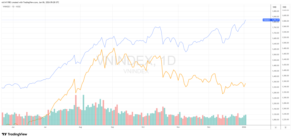 Vnindex ( xanh) và Vnindex – (VIC VHM VPL) ( cam)